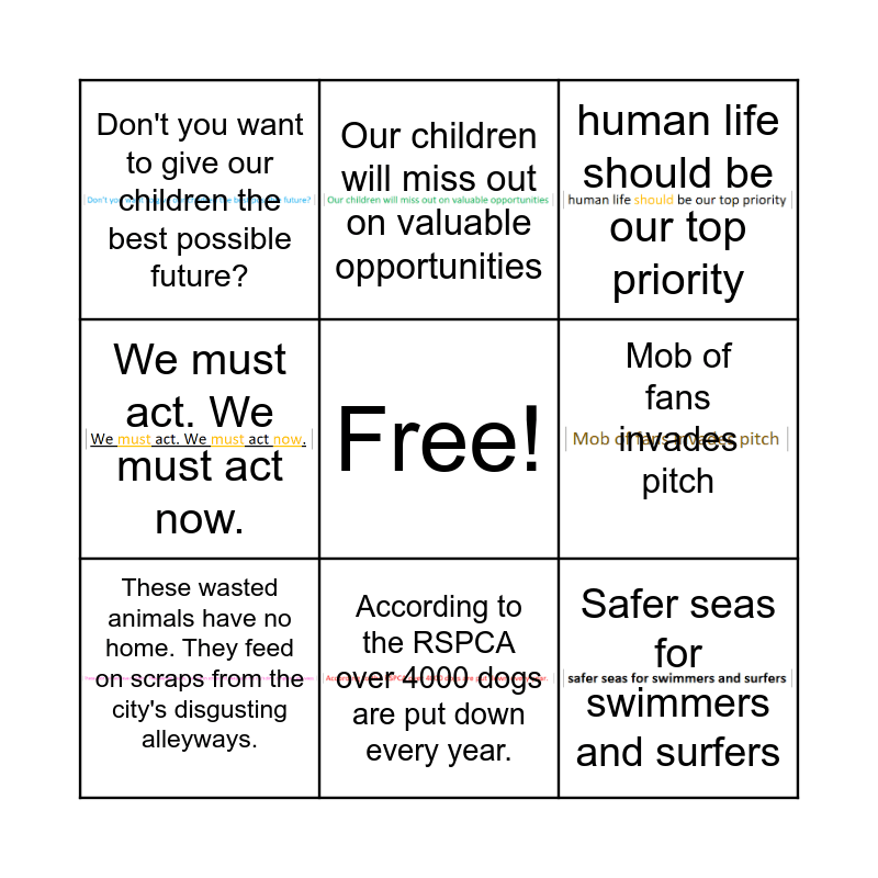 This bingo card has 8 images, a free space and 8 words: Mob of fans invades pitch, human life should be our top priority, Our children will miss out on valuable opportunities, These wasted animals have no home. They feed on scraps from the city's disgusting alleyways., Don't you want to give our children the best possible future?, Safer seas for swimmers and surfers, We must act. We must act now. and According to the RSPCA over 4000 dogs are put down every year..