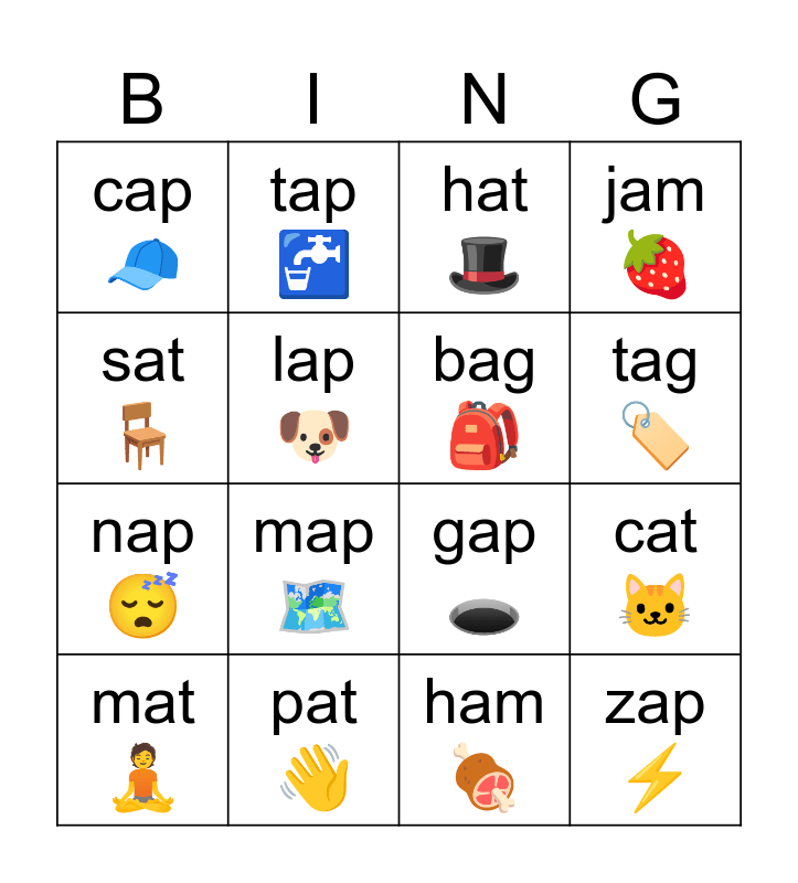 This bingo card has 20 words: cat π±, bat π¦, hat π©, rat π, mat π§, sat πͺ, pat π, cap π§’, nap π΄, tap π°, map πΊοΈ, gap π³οΈ, lap πΆ, zap β‘, bag π, rag π§½, tag π·οΈ, jam π, ham π and pan π³.