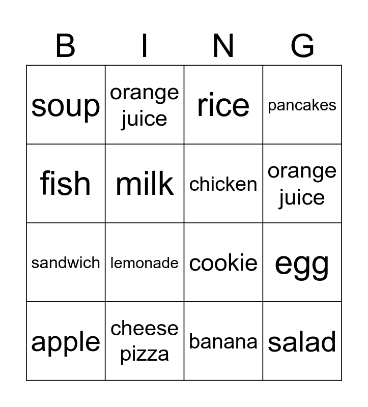 This bingo card has 16 words: cheese pizza, egg, rice, soup, sandwich, orange juice, cookie, banana, fish, milk, apple, pancakes, lemonade, orange juice, chicken and salad.
