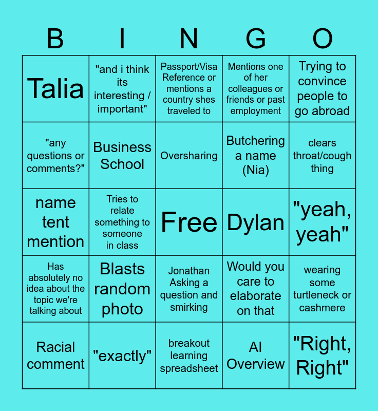 This bingo card has a free space and 24 words: Blasts random photo, "exactly", Oversharing, Racial comment, Trying to convince people to go abroad, Talia, "any questions or comments?", "and i think its interesting / important", Dylan, Jonathan Asking a question and smirking, Butchering a name (Nia), name tent mention, Would you care to elaborate on that, wearing some turtleneck or cashmere, Business School, AI Overview, "yeah, yeah", Passport/Visa Reference or mentions a country shes traveled to, clears throat/cough thing, Tries to relate something to someone in class, "Right, Right", Has absolutely no idea about the topic we're talking about, Mentions one of her colleagues or friends or past employment and breakout learning spreadsheet.