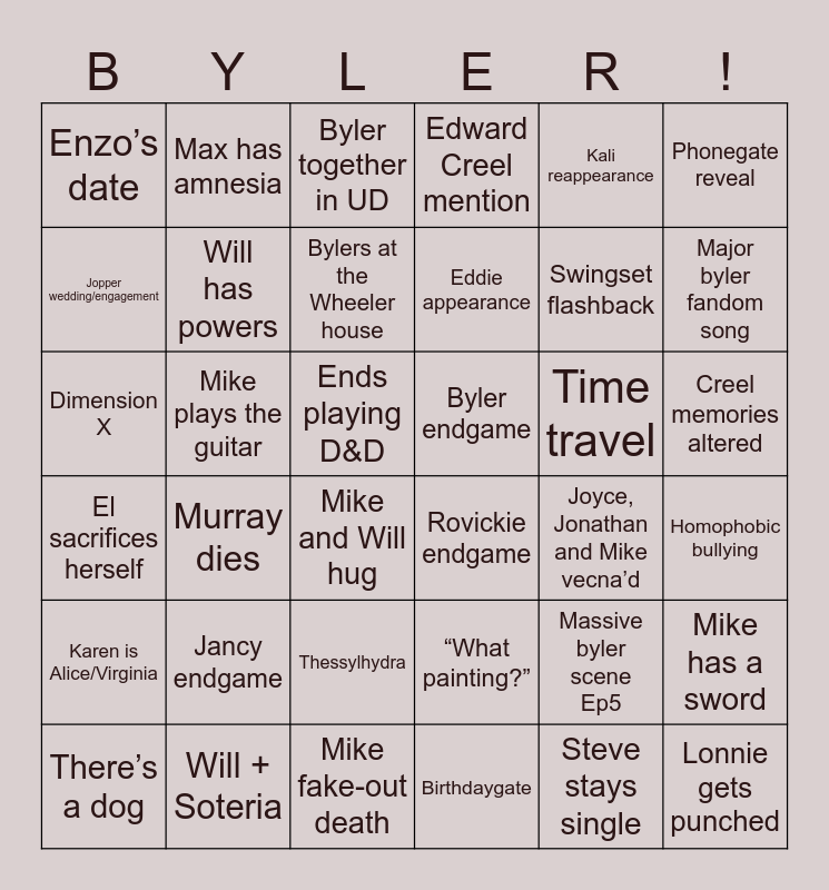This bingo card has 36 words: “What painting?”, Thessylhydra, Birthdaygate, Jopper wedding/engagement, El sacrifices herself, Byler endgame, Will has powers, Mike fake-out death, Kali reappearance, Massive byler scene Ep5, Major byler fandom song, Edward Creel mention, Mike has a sword, Mike plays the guitar, Eddie appearance, Enzo’s date, Karen is Alice/Virginia, Time travel, Dimension X, Byler together in UD, Ends playing D&D, Murray dies, Rovickie endgame, Mike and Will hug, Joyce, Jonathan and Mike vecna’d, Max has amnesia, Swingset flashback, Will + Soteria, Bylers at the Wheeler house, Phonegate reveal, Lonnie gets punched, There’s a dog, Homophobic bullying, Creel memories altered, Jancy endgame and Steve stays single.