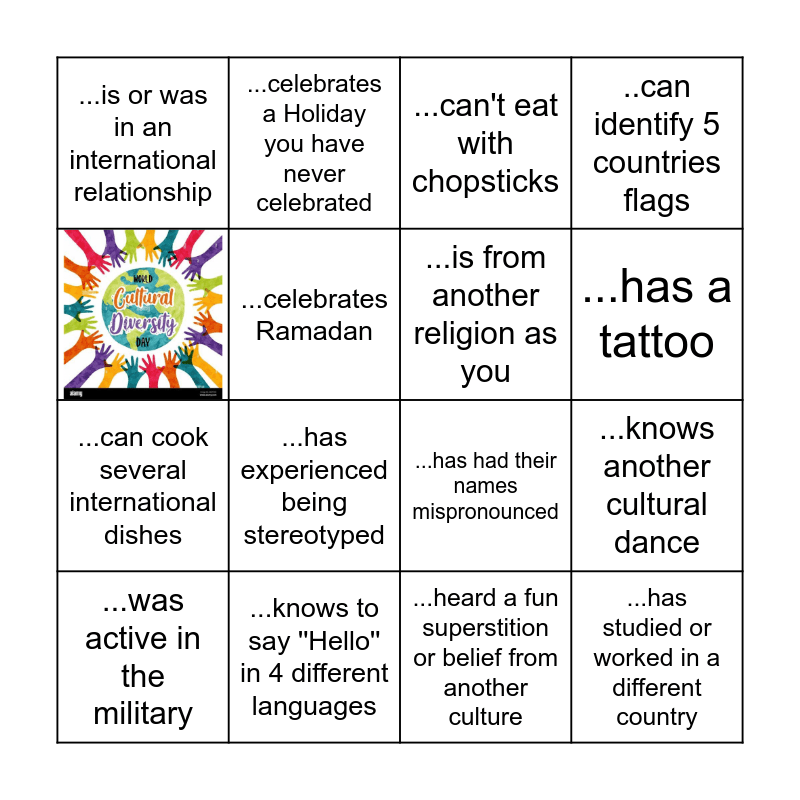 This bingo card has 1 images and 15 words: ...knows to say ''Hello'' in 4 different languages, ...knows another cultural dance, ...can't eat with chopsticks, ...is or was in an international relationship, ...can cook several international dishes, ...celebrates a Holiday you have never celebrated, ...has had their names mispronounced, ...heard a fun superstition or belief from another culture, ...celebrates Ramadan, ...was active in the military, ..can identify 5 countries flags, ...has experienced being stereotyped, ...has a tattoo, ...is from another religion as you and ...has studied or worked in a different country.