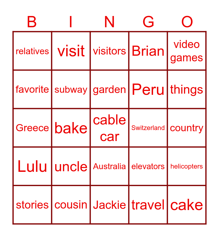 This bingo card has a free space and 24 words: uncle, cousin, garden, stories, video games, relatives, favorite, visit, Switzerland, Australia, Peru, Greece, elevators, helicopters, subway, travel, country, visitors, things, bake, cake, Lulu, Brian and Jackie.