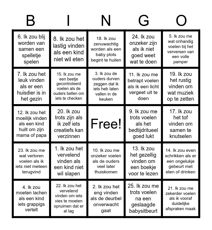 This bingo card has a free space and 25 words: 1. Ik zou het vervelend vinden als een kind niet wil slapen, 2. Ik zou het eng vinden als de deurbel onverwacht gaat, 3. Ik zou de ouders durven zeggen dat ik iets heb laten vallen in de keuken, 4. Ik zou moeten lachen als een kind iets grappigs vertelt, 5. Ik zou me wat onhandig voelen bij het verversen van een volle pamper, 6. Ik zou blij worden van samen een spelletje spelen, 7. Ik zou het leuk vinden als er een huisdier is in het gezin, 8. Ik zou het lastig vinden als een kind niet wil eten, 9. Ik zou me trots voelen als het bedtijdritueel goed lukt, 10. Ik zou me onzeker voelen als de ouders veel later thuiskomen, 11. Ik zou me betrapt voelen als ik een licht vergeet uit te doen, 12. Ik zou het moeilijk vinden als een kind huilt om zijn mama of papa, 13. Ik zou het gezellig vinden om een boekje voor te lezen, 14. Ik zou even schrikken als er een ongelukje gebeurt met eten of drinken, 15. Ik zou me een beetje gecontroleerd voelen als de ouders bellen om iets te checken, 16. Ik zou twijfelen als een kind vraagt om op de tablet te mogen, 17. Ik zou het tof vinden om samen te knutselen, 18. Ik zou zenuwachtig worden als een baby plots begint te huilen, 19. Ik zou het rustig vinden om wat muziek op te zetten, 20. Ik zou trots zijn als ik zelf iets creatiefs kan verzinnen, 21. Ik zou me zekerder voelen als ik vooraf duidelijke afspraken maak, 22. Ik zou het vervelend vinden om iets vies te moeten opruimen dat er al lag, 23. Ik zou me wat verloren voelen als ik iets niet meteen terugvind, 24. Ik zou onzeker zijn als ik niet goed weet wat te doen and 25. Ik zou me trots voelen na een geslaagde babysitbeurt.