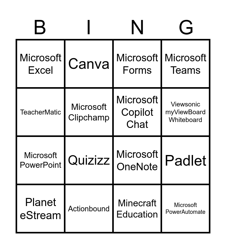 This bingo card has 22 words: Actionbound, Bingo Baker, Canva, Edpuzzle, Microsoft Clipchamp, Microsoft Copilot Chat, Microsoft Excel, Microsoft Forms, Microsoft OneNote, Microsoft PowerAutomate, Microsoft PowerPoint, Microsoft Teams, Microsoft Whiteboard, Microsoft Word, Minecraft Education, Moodle, Padlet, Planet eStream, Quizizz, TeacherMatic, Viewsonic myViewBoard Whiteboard and Wordwall.