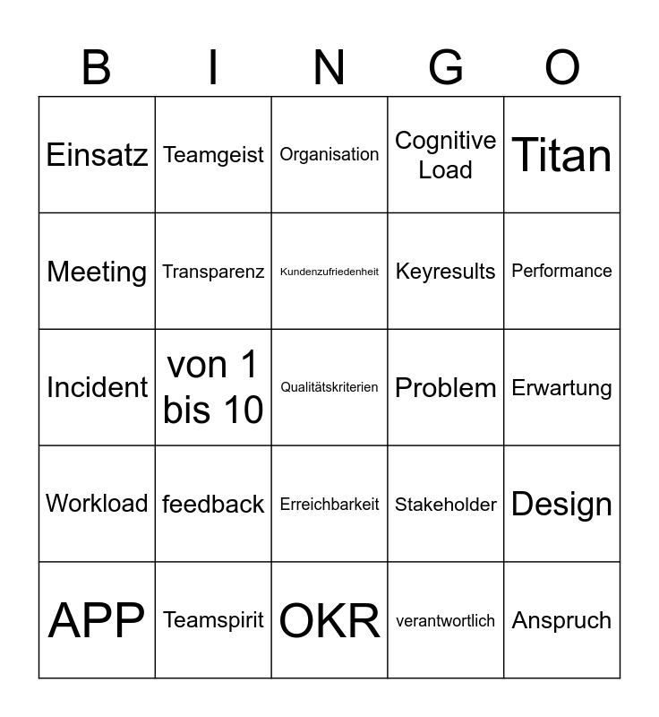 This bingo card has 25 words: feedback, OKR, Kundenzufriedenheit, APP, Titan, Einsatz, Meeting, Teamgeist, Problem, Erreichbarkeit, Keyresults, Incident, Stakeholder, Design, Transparenz, Anspruch, Erwartung, Organisation, Performance, von 1 bis 10, Qualitätskriterien, Teamspirit, Workload, Cognitive Load and verantwortlich.