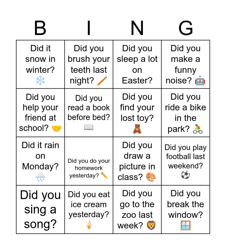 This bingo card has 16 words: Did you eat ice cream yesterday? 🍦, Did you play football last weekend? ⚽, Did you sleep a lot on Easter?, Did it snow in winter? ❄️, Did it rain on Monday? 🌧️, Did you brush your teeth last night? 🪥, Did you draw a picture in class? 🎨, Did you go to the zoo last week? 🦁, Did you help your friend at school? 🤝, Did you read a book before bed? 📖, Did you sing a song?, Did you make a funny noise? 🤖, Did you do your homework yesterday? ✏️, Did you ride a bike in the park? 🚴, Did you find your lost toy? 🧸 and Did you break the window? 🪟.
