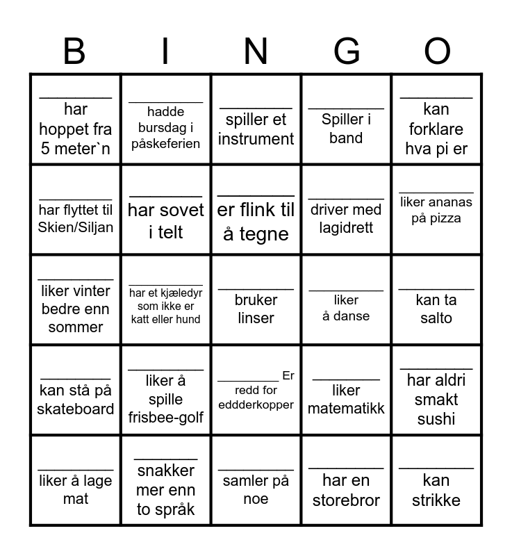 This bingo card has a free space and 24 words: _________ liker å spille frisbee-golf, _______ snakker mer enn to språk, _______ er flink til å tegne, _________ liker å lage mat, ________ kan forklare hva pi er, ________ har hoppet fra 5 meter`n, _________ har flyttet til Skien/Siljan, __________ hadde bursdag i påskeferien, __________ liker å danse, _________ Er redd for eddderkopper, _________ driver med lagidrett, _________ liker vinter bedre enn sommer, ________ liker matematikk, ________ har aldri smakt sushi, _______ har sovet i telt, ________ har en storebror, _________ kan ta salto, ________ spiller et instrument, __________ liker ananas på pizza, ____________ har et kjæledyr som ikke er katt eller hund, ________ kan strikke, ________ kan stå på skateboard, _________ Spiller i band and _________ samler på noe.