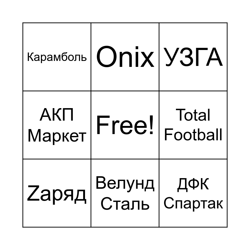 This bingo card has a free space and 46 words: ADR, Cashflow, Dragon СШОР Лидер, FDV, Football United, GG, Onix, Tomimo Tokoso, Total Football, USW, Zaряд, АКП Маркет, Ани Армения, Бантер Групп, Барс, Броня, Велунд Сталь, Галактикос, Галактикос-2, ДФК Спартак, Евразия, Инком-Металл, Карамболь, Кристалл, Луч, Металлург-КЗФ, Метеор, Молодежка, НЕОспорт, Олимп, Пахтакор, Подвижник, Регион, Рубинатор, Солнечный, Солнечный IX, Средний Урал, Стандарт ВТД, Твенте, Титан, Транслайн, УЗГА, УПК, Уралмаш ЦП, Уралтелеком-С and Черные медведи.