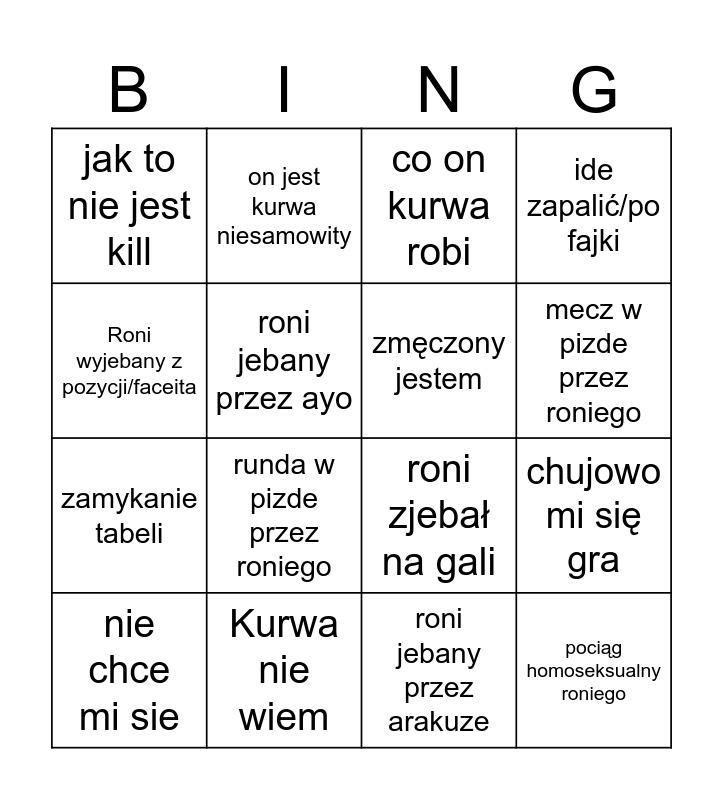 This bingo card has 16 words: Kurwa nie wiem, chujowo mi się gra, co on kurwa robi, jak to nie jest kill, zamykanie tabeli, on jest kurwa niesamowity, roni zjebał na gali, roni jebany przez arakuze, Roni wyjebany z pozycji/faceita, roni jebany przez ayo, nie chce mi sie, ide zapalić/po fajki, runda w pizde przez roniego, mecz w pizde przez roniego, zmęczony jestem and pociąg homoseksualny roniego.