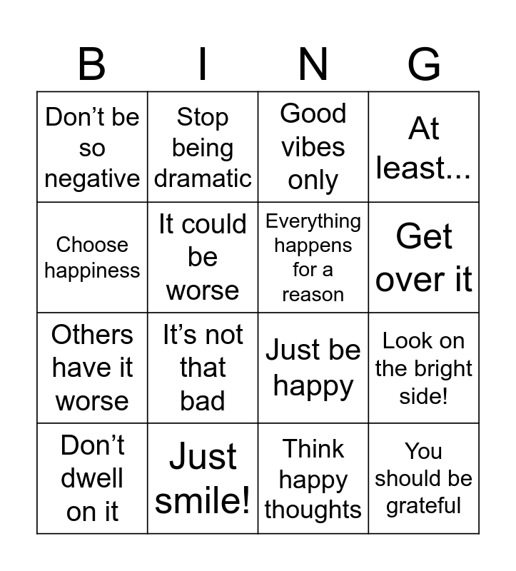 This bingo card has 16 words: Just smile!, Look on the bright side!, Good vibes only, Don’t be so negative, Others have it worse, Stop being dramatic, Just be happy, Think happy thoughts, Choose happiness, It could be worse, Don’t dwell on it, At least..., It’s not that bad, Get over it, Everything happens for a reason and You should be grateful.