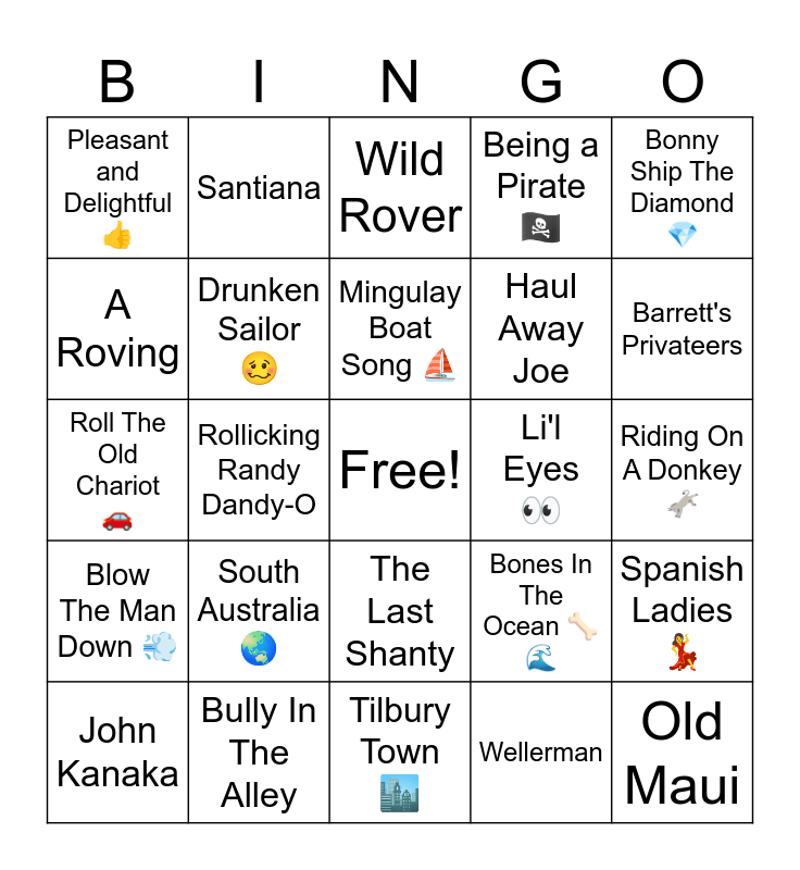This bingo card has a free space and 28 words: Spanish Ladies ð, All For Me Grog ðš, Haul Away Joe, Wellerman, A Roving, Wild Rover, Santiana, Blow The Man Down ðĻ, Li'l Eyes ð, John Kanaka, Roll The Old Chariot ð, Being a Pirate ðīââ ïļ, Bully In The Alley, Tilbury Town ðïļ, Barrett's Privateers, Row Me Bully Boys ðĢ, South Australia ð, Drunken Sailor ðĨī, Mingulay Boat Song âĩ, The Last Shanty, Pleasant and Delightful ð, Leave Her Johnny, Old Maui, Rollicking Randy Dandy-O, Riding On A Donkey ðŦ, Bones In The Ocean ðĶīð, Bonny Ship The Diamond ð and The Banks of Newfoundland.