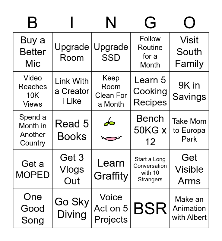 This bingo card has a free space and 24 words: One Good Song, Get 3 Vlogs Out, Keep Room Clean For a Month, BSR, Visit South Family, Buy a Better Mic, Upgrade Room, Upgrade SSD, Bench 50KG x 12, Take Mom to Europa Park, Spend a Month in Another Country, Link With a Creator i Like, Start a Long Conversation with 10 Strangers, Get Visible Arms, Video Reaches 10K Views, Go Sky Diving, Voice Act on 5 Projects, Follow Routine for a Month, 9K in Savings, Get a MOPED, Read 5 Books, Learn Graffity, Learn 5 Cooking Recipes and Make an Animation with Albert.