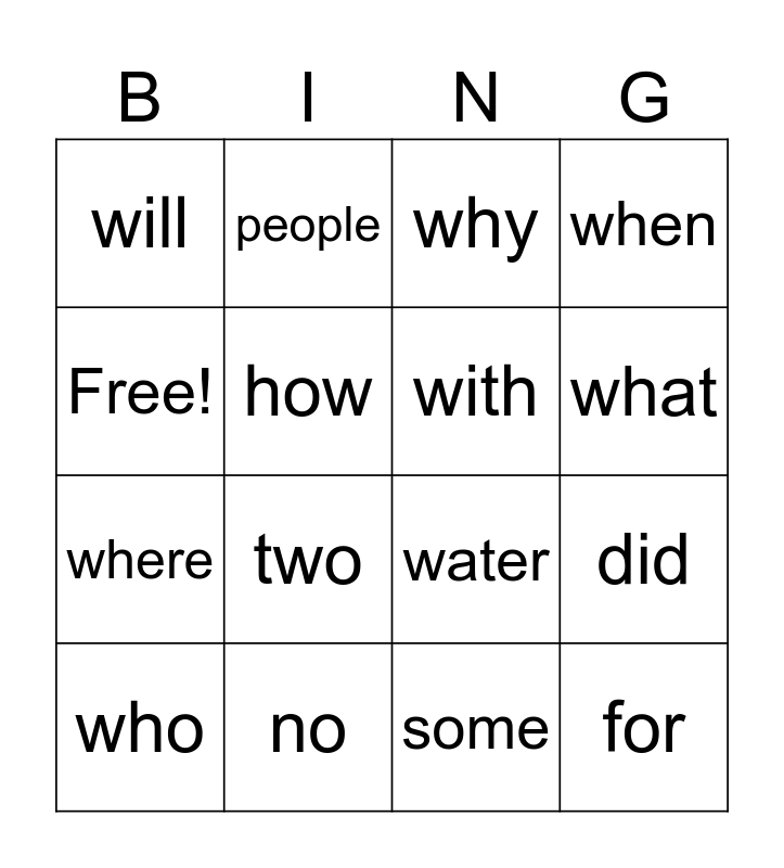 This bingo card has 16 words: no, did, why, will, where, people, water, some, Free!, how, who, when, two, what, with and for.
