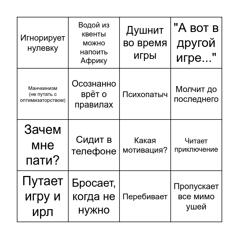 This bingo card has 16 words: Бросает, когда не нужно, Читает приключение, Душнит во время игры, Игнорирует нулевку, Зачем мне пати?, Водой из квенты можно напоить Африку, Какая мотивация?, Перебивает, Манчкинизм (не путать с оптимизаторством), Осознанно врёт о правилах, Путает игру и ирл, "А вот в другой игре...", Сидит в телефоне, Молчит до последнего, Психопатыч and Пропускает все мимо ушей.