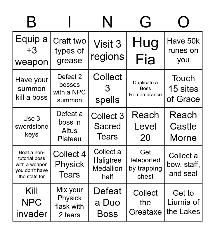 This bingo card has a free space and 41 words: Defeat a non-tutorial boss with only jump attacks, Use 3 swordstone keys, Talk to Blaidd, Defeat 2 bosses with a NPC summon, Mix your Physick flask with 2 tears, Collect a Haligtree Medallion half, Collect 3 spells, Defeat Radhann, Have 50k runes on you, Beat a non-tutorial boss with a weapon you don't have the stats for, Defeat a boss in Altus Plateau, Hug Fia, Get to Liurnia of the Lakes, Reach Castle Morne, Reach Level 20, Collect 4 Physick Tears, Collect 3 Incantations, Equip a +3 weapon, Get to Volcano Manor, Visit 3 regions, Collect a bow, staff, and seal, Free Alexander, Defeat a Duo Boss, Duplicate a Boss Remembrance, Complete two catacombs, Have 25 Faith, Collect the Greataxe, Have 3 Spells, Touch 15 sites of Grace, Beat a boss with a heavy load, Kill a named boss using only parries, Craft two types of grease, Kill NPC invader, Defeat an Erdtree Avatar, Get teleported by trapping chest, Have your summon kill a boss, Collect 15 mushrooms, Equip an Altered piece of armor, Defeat two Evergaols, Mix a Flask of Wondrous Physick and Open 3 Imp statues with Stonesword Keys.