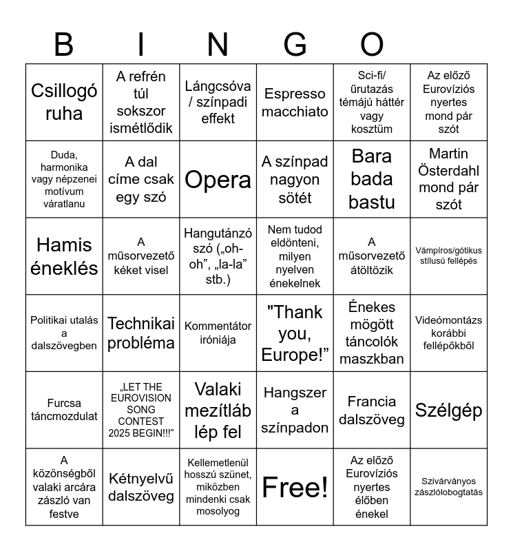 This bingo card has 40 words: Kellemetlenül hosszú szünet, miközben mindenki csak mosolyog, Bara bada bastu, Piros haj, Duda, harmonika vagy népzenei motívum váratlanu, "Thank you, Europe!”, Vámpíros/gótikus stílusú fellépés, A dal címe csak egy szó, Az énekes sír az előadás végén, Sci-fi/űrutazás témájú háttér vagy kosztüm, Nem tudod eldönteni, milyen nyelven énekelnek, Martin Österdahl mond pár szót, Espresso macchiato, Hamis éneklés, Hangutánzó szó („oh-oh”, „la-la” stb.), A műsorvezető kéket visel, A műsorvezető átöltözik, Szélgép, Csillogó ruha, Free!, Lángcsóva / színpadi effekt, Technikai probléma, Videómontázs korábbi fellépőkből, Opera, Az előző Eurovíziós nyertes mond pár szót, Az előző Eurovíziós nyertes élőben énekel, Hangszer a színpadon, „LET THE EUROVISION SONG CONTEST 2025 BEGIN!!!”, Szivárványos zászlólobogtatás, Furcsa táncmozdulat, Valaki mezítláb lép fel, LED-falon látványos animáció, Kommentátor iróniája, A közönségből valaki arcára zászló van festve, Politikai utalás a dalszövegben, A színpad nagyon sötét, Énekes mögött táncolók maszkban, Francia dalszöveg, Kétnyelvű dalszöveg, A refrén túl sokszor ismétlődik and „Don’t forget to vote!”.