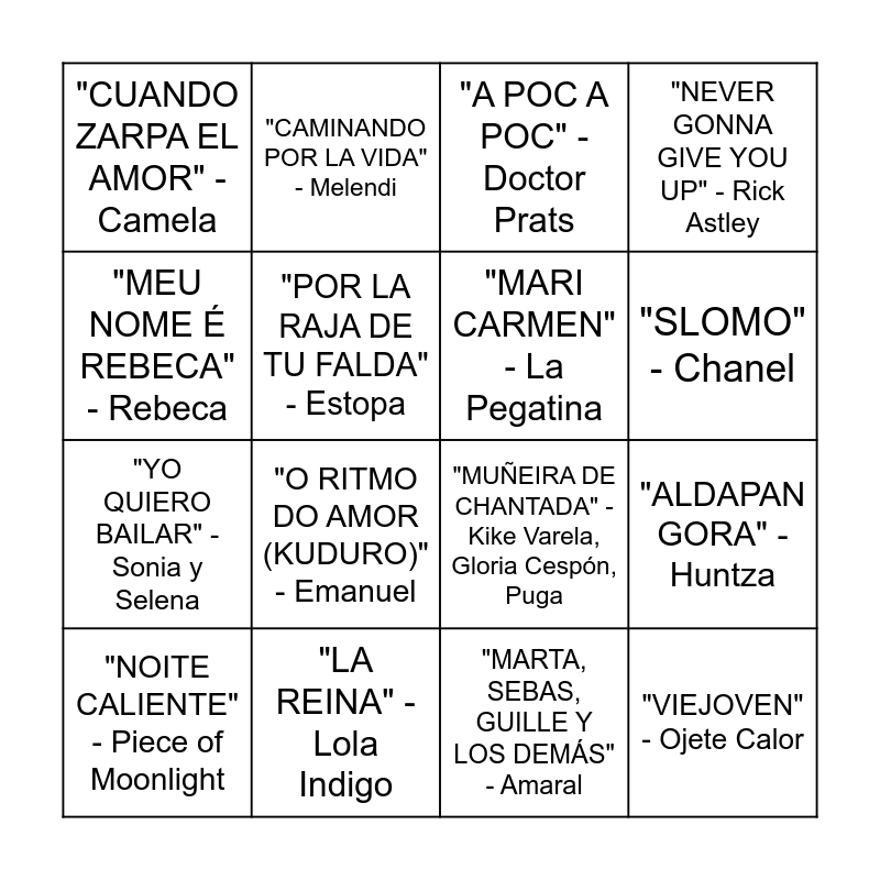 This bingo card has 21 words: "LA REINA" - Lola Indigo, "PUEDES CONTAR CONMIGO" - María Sarmiento x LODVG, "CAMINANDO POR LA VIDA" - Melendi, "ZAPATILLAS" - El Canto del Loco, "MARTA, SEBAS, GUILLE Y LOS DEMÁS" - Amaral, "MARI CARMEN" - La Pegatina, "CUANDO ZARPA EL AMOR" - Camela, "A POC A POC" - Doctor Prats, "MUÑEIRA DE CHANTADA" - Kike Varela, Gloria Cespón, Puga, "SLOMO" - Chanel, "YO QUIERO BAILAR" - Sonia y Selena, "NEVER GONNA GIVE YOU UP" - Rick Astley, "VIEJOVEN" - Ojete Calor, "SAMBA DO BRASIL" - Bellini, "POR LA RAJA DE TU FALDA" - Estopa, "A GARAGEM DA VIZINHA" - Quim Barreiros, "NOITE CALIENTE" - Piece of Moonlight, "O RITMO DO AMOR (KUDURO)" - Emanuel, "MEU NOME É REBECA" - Rebeca, "ALDAPAN GORA" - Huntza and "AI SE EU TE PEGO" - Michel Teló.