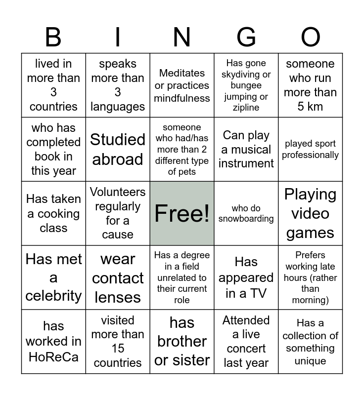 This bingo card has a free space and 24 words: wear contact lenses, visited more than 15 countries, someone who had/has more than 2 different type of pets, has worked in HoReCa, someone who run more than 5 km, lived in more than 3 countries, who has completed book in this year, speaks more than 3 languages, who do snowboarding, Has a degree in a field unrelated to their current role, Can play a musical instrument, Has taken a cooking class, Has appeared in a TV, Prefers working late hours (rather than morning), Studied abroad, Attended a live concert last year, Playing video games, Meditates or practices mindfulness, played sport professionally, Volunteers regularly for a cause, Has a collection of something unique, Has met a celebrity, Has gone skydiving or bungee jumping or zipline and has brother or sister.