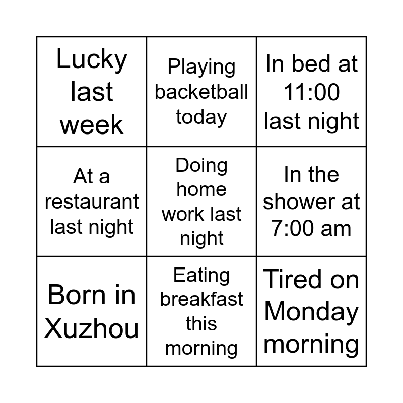 This bingo card has 24 words: Asleep at 6:00 am, With friends last night, Eating breakfast this morning, On Vacation in August, Doing home work last night, Lucky last week, In the shower at 7:00 am, Playing backetball today, Happy yesterday, Excited last Summer, Tired on Monday morning, Reading a book at lunch, At school at 8:00 today, With their family last Sunday, Born in Xuzhou, Alone at 9:00 last Friday, At home on Sunday, In bed at 11:00 last night, Bored in math class today, Sick last year, At the park on Saturday, Running in PE class today, At a restaurant last night and Having a science class today.