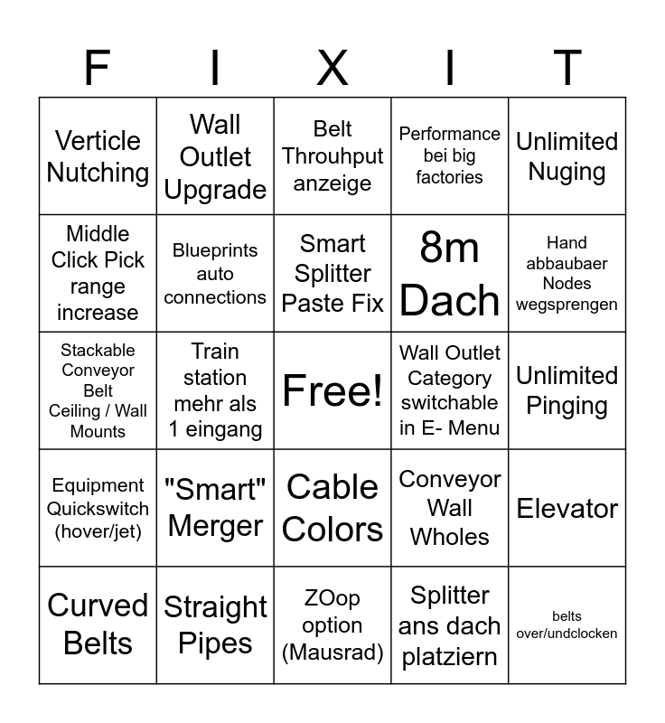 This bingo card has a free space and 24 words: "Smart" Merger, Straight Pipes, Smart Splitter Paste Fix, Curved Belts, Unlimited Nuging, Verticle Nutching, Middle Click Pick range increase, Wall Outlet Upgrade, Wall Outlet Category switchable in E- Menu, Cable Colors, 8m Dach, Stackable Conveyor Belt Ceiling / Wall Mounts, Conveyor Wall Wholes, Elevator, Blueprints auto connections, Splitter ans dach platziern, Unlimited Pinging, Belt Throuhput anzeige, Hand abbaubaer Nodes wegsprengen, Train station mehr als 1 eingang, belts over/undclocken, Equipment Quickswitch (hover/jet), Performance bei big factories and ZOop option (Mausrad).