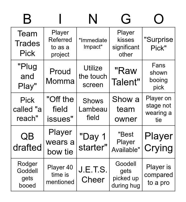 This bingo card has a free space and 25 words: Player wears a bow tie, J.E.T.S. Cheer, Utilize the touch screen, Rodger Goddell gets booed, "Surprise Pick", Team Trades Pick, "Plug and Play", Player Referred to as a project, Show a team owner, "Day 1 starter", "Raw Talent", Pick called "a reach", "Best Player Available", Player Crying, Proud Momma, The pick is in less than 30 secs on the clock, Player on stage not wearing a tie, "Immediate Impact", Fans shown booing pick, "Off the field issues", Player is compared to a pro, Player 40 time is mentioned, QB drafted, Player kisses significant other and Goodell gets picked up during hug.
