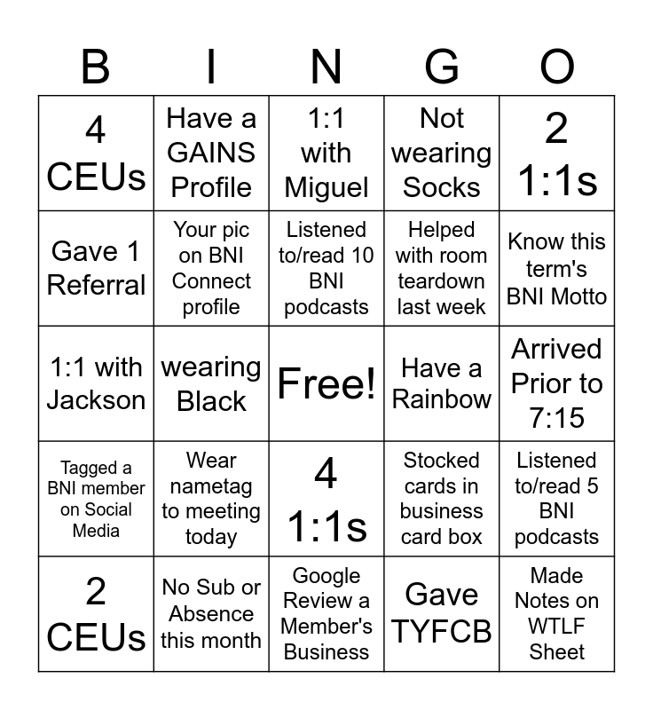 This bingo card has a free space and 24 words: Wear nametag to meeting today, No Sub or Absence this month, Listened to/read 10 BNI podcasts, 2 CEUs, 2 1:1s, 4 CEUs, Gave 1 Referral, Have a GAINS Profile, Have a Rainbow, 4 1:1s, Helped with room teardown last week, 1:1 with Jackson, Stocked cards in business card box, Listened to/read 5 BNI podcasts, Your pic on BNI Connect profile, Gave TYFCB, Arrived Prior to 7:15, 1:1 with Miguel, Know this term's BNI Motto, wearing Black, Made Notes on WTLF Sheet, Tagged a BNI member on Social Media, Not wearing Socks and Google Review a Member's Business.