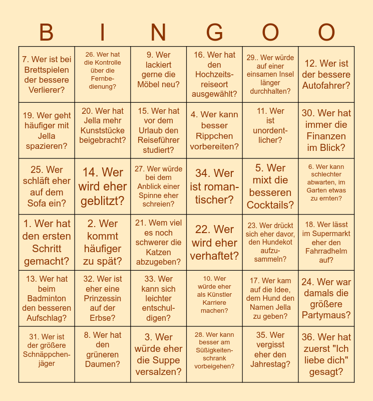 This bingo card has 36 words: 1. Wer hat den ersten Schritt gemacht?, 2. Wer kommt häufiger zu spät?, 3. Wer würde eher die Suppe versalzen?, 4. Wer kann besser Rippchen vorbereiten?, 5. Wer mixt die besseren Cocktails?, 6. Wer kann schlechter abwarten, im Garten etwas zu ernten?, 7. Wer ist bei Brettspielen der bessere Verlierer?, 8. Wer hat den grüneren Daumen?, 9. Wer lackiert gerne die Möbel neu?, 10. Wer würde eher als Künstler Karriere machen?, 11. Wer ist unordent-licher?, 12. Wer ist der bessere Autofahrer?, 13. Wer hat beim Badminton den besseren Aufschlag?, 14. Wer wird eher geblitzt?, 15. Wer hat vor dem Urlaub den Reiseführer studiert?, 16. Wer hat den Hochzeits-reiseort ausgewählt?, 17. Wer kam auf die Idee, dem Hund den Namen Jella zu geben?, 18. Wer lässt im Supermarkt eher den Fahrradhelm auf?, 19. Wer geht häufiger mit Jella spazieren?, 20. Wer hat Jella mehr Kunststücke beigebracht?, 21. Wem viel es noch schwerer die Katzen abzugeben?, 22. Wer wird eher verhaftet?, 23. Wer drückt sich eher davor, den Hundekot aufzu-sammeln?, 24. Wer war damals die größere Partymaus?, 25. Wer schläft eher auf dem Sofa ein?, 26. Wer hat die Kontrolle über die Fernbe-dienung?, 27. Wer würde bei dem Anblick einer Spinne eher schreien?, 28. Wer kann besser am Süßigkeiten-schrank vorbeigehen?, 29.. Wer würde auf einer einsamen Insel länger durchhalten?, 30. Wer hat immer die Finanzen im Blick?, 31. Wer ist der größere Schnäppchen-jäger, 32. Wer ist eher eine Prinzessin auf der Erbse?, 33. Wer kann sich leichter entschul-digen?, 34. Wer ist roman-tischer?, 35. Wer vergisst eher den Jahrestag? and 36. Wer hat zuerst "Ich liebe dich" gesagt?.