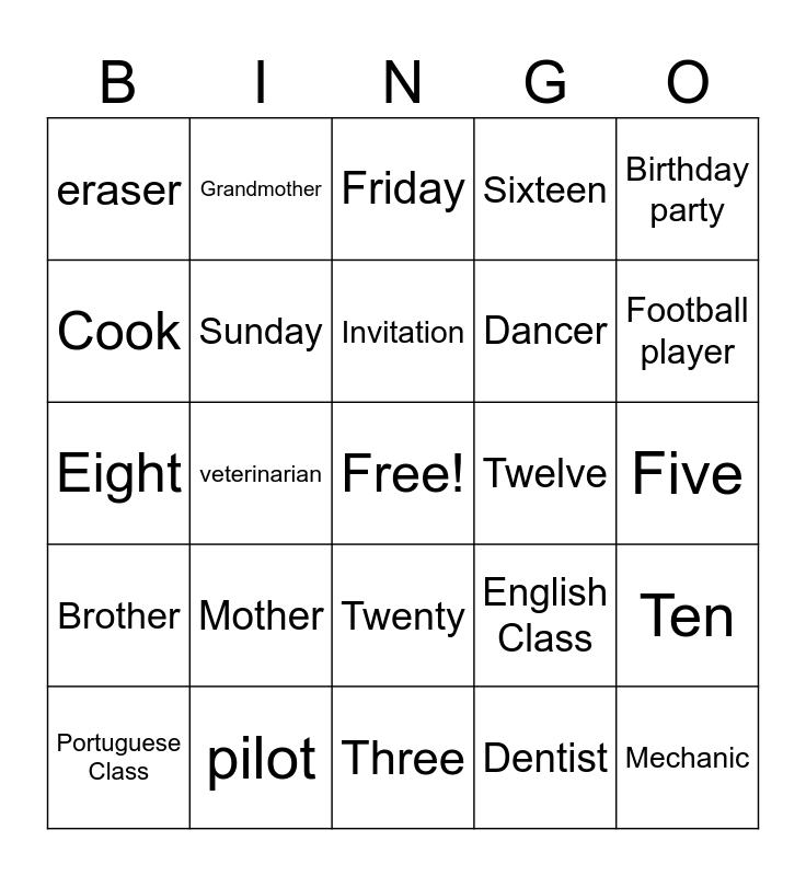 This bingo card has a free space and 30 words: pilot, doctor, veterinarian, notebook, eraser, Friday, Sunday, Twenty, Twelve, Three, Five, Mechanic, Dentist, Athlete, Football player, Teacher, English Class, Brother, Mother, Birthday party, Eight, Sister, Grandmother, Dancer, Cook, Sixteen, Ten, Portuguese Class, Invitation and Halloween.