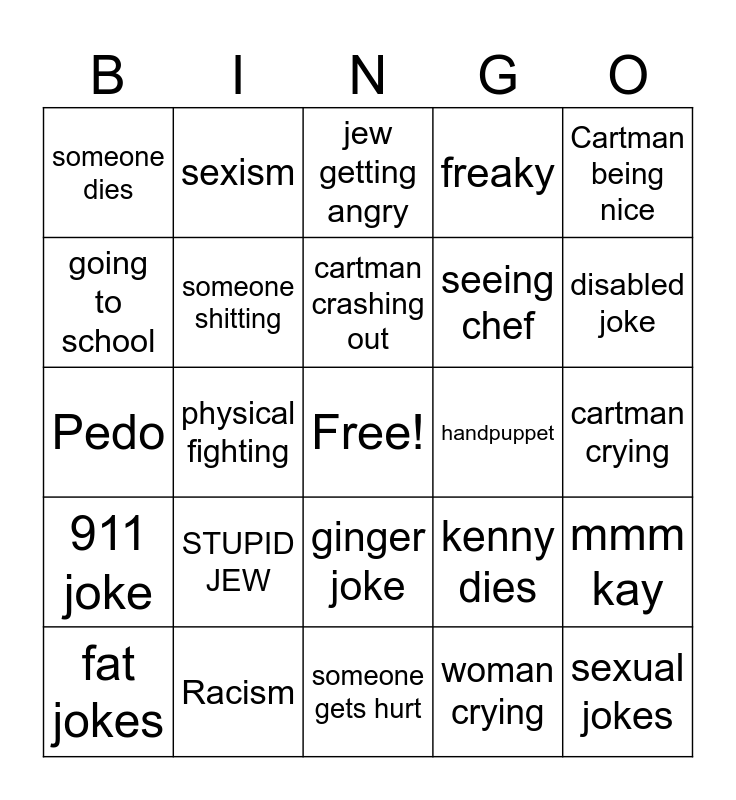 This bingo card has a free space and 24 words: STUPID JEW, Racism, cartman crashing out, fat jokes, Cartman being nice, someone dies, going to school, sexism, handpuppet, ginger joke, seeing chef, Pedo, kenny dies, mmm kay, someone shitting, woman crying, cartman crying, jew getting angry, disabled joke, physical fighting, sexual jokes, 911 joke, freaky and someone gets hurt.