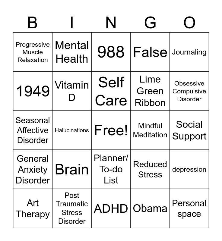 This bingo card has a free space and 28 words: depression, Bipolar, Lime Green Ribbon, Obama, 1949, 988, Mental Health, General Anxiety Disorder, Mindful Meditation, Art Therapy, Seasonal Affective Disorder, False, Post Traumatic Stress Disorder, ADHD, Obsessive Compulsive Disorder, Mental Health Stigma, Brain, Vitamin D, Self Care, Planner/ To-do List, Progressive Muscle Relaxation, Assertive, Personal space, Halucinations, Social Support, Reduced Stress, Journaling and Restlessness.