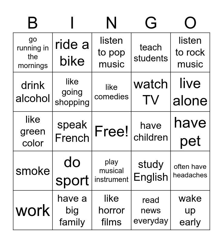 This bingo card has a free space and 24 words: do sport, have a big family, like comedies, work, listen to rock music, go running in the mornings, drink alcohol, ride a bike, have children, play musical instrument, watch TV, like green color, study English, often have headaches, like going shopping, read news everyday, have pet, listen to pop music, live alone, speak French, wake up early, smoke, teach students and like horror films.