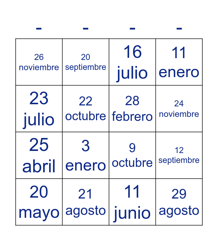 This bingo card has 19 words: 9 octubre, 29 septiembre, 16 julio, 29 agosto, 12 septiembre, 23 julio, 11 junio, 26 noviembre, 20 septiembre, 25 abril, 3 enero, 22 octubre, 28 febrero, 21 agosto, 20 mayo, 9 septiembre, 11 enero, 24 noviembre and 9 febrero.