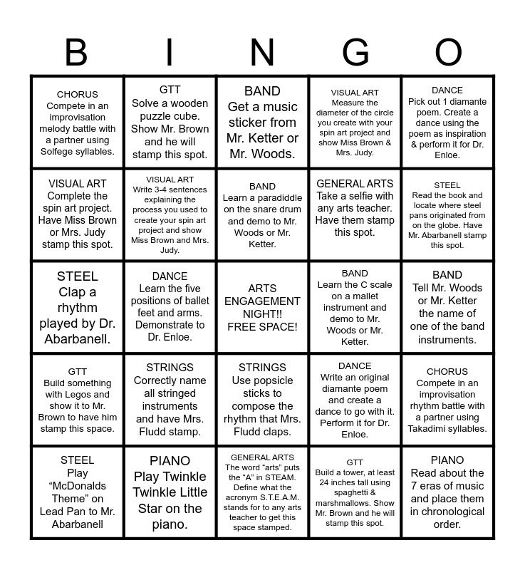 This bingo card has a free space and 24 words: STRINGS Correctly name all stringed instruments and have Mrs. Fludd stamp., PIANO Play Twinkle Twinkle Little Star on the piano., BAND Learn a paradiddle on the snare drum and demo to Mr. Woods or Mr. Ketter., STEEL Play “McDonalds Theme” on Lead Pan to Mr. Abarbanell, DANCE Pick out 1 diamante poem. Create a dance using the poem as inspiration & perform it for Dr. Enloe., CHORUS Compete in an improvisation melody battle with a partner using Solfege syllables., VISUAL ART Complete the spin art project. Have Miss Brown or Mrs. Judy stamp this spot., GTT Solve a wooden puzzle cube. Show Mr. Brown and he will stamp this spot., BAND Learn the C scale on a mallet instrument and demo to Mr. Woods or Mr. Ketter., STRINGS Use popsicle sticks to compose the rhythm that Mrs. Fludd claps., GENERAL ARTS Take a selfie with any arts teacher. Have them stamp this spot., STEEL Clap a rhythm played by Dr. Abarbanell., DANCE Write an original diamante poem and create a dance to go with it. Perform it for Dr. Enloe., CHORUS Compete in an improvisation rhythm battle with a partner using Takadimi syllables., VISUAL ART Write 3-4 sentences explaining the process you used to create your spin art project and show Miss Brown and Mrs. Judy., GTT Build a tower, at least 24 inches tall using spaghetti & marshmallows. Show Mr. Brown and he will stamp this spot., BAND Tell Mr. Woods or Mr. Ketter the name of one of the band instruments., BAND Get a music sticker from Mr. Ketter or Mr. Woods., STEEL Read the book and locate where steel pans originated from on the globe. Have Mr. Abarbanell stamp this spot., DANCE Learn the five positions of ballet feet and arms. Demonstrate to Dr. Enloe., PIANO Read about the 7 eras of music and place them in chronological order., GTT Build something with Legos and show it to Mr. Brown to have him stamp this space., VISUAL ART Measure the diameter of the circle you create with your spin art project and show Miss Brown & Mrs. Judy. and GENERAL ARTS The word “arts” puts the “A” in STEAM. Define what the acronym S.T.E.A.M. stands for to any arts teacher to get this space stamped..