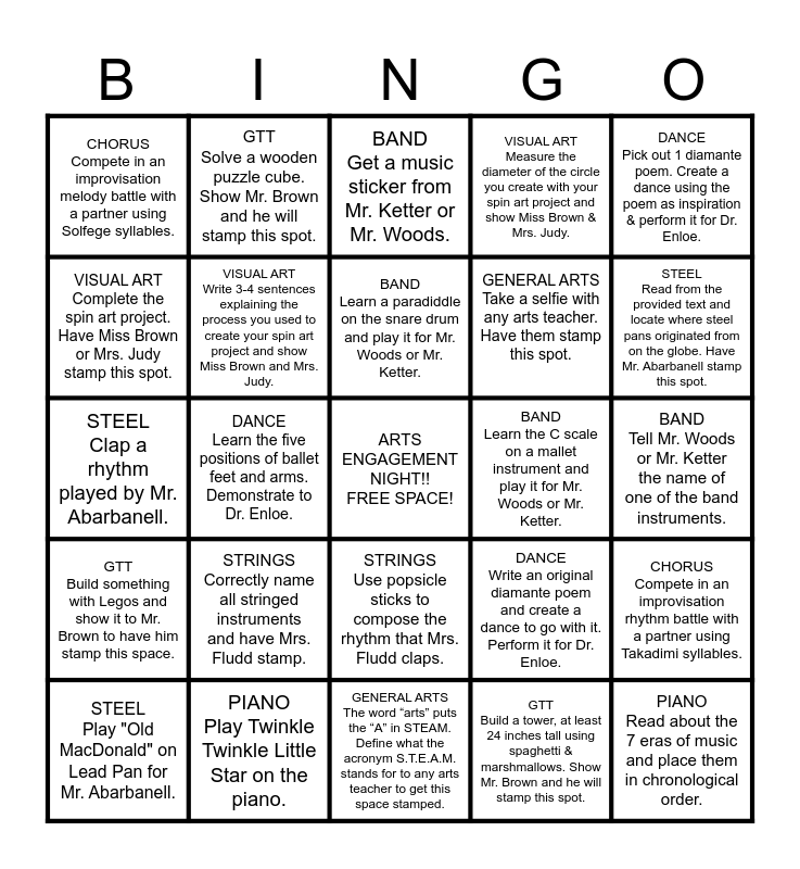 This bingo card has a free space and 24 words: STRINGS Correctly name all stringed instruments and have Mrs. Fludd stamp., PIANO Play Twinkle Twinkle Little Star on the piano., BAND Learn a paradiddle on the snare drum and play it for Mr. Woods or Mr. Ketter., STEEL Play "Old MacDonald" on Lead Pan for Mr. Abarbanell., DANCE Pick out 1 diamante poem. Create a dance using the poem as inspiration & perform it for Dr. Enloe., CHORUS Compete in an improvisation melody battle with a partner using Solfege syllables., VISUAL ART Complete the spin art project. Have Miss Brown or Mrs. Judy stamp this spot., GTT Solve a wooden puzzle cube. Show Mr. Brown and he will stamp this spot., BAND Learn the C scale on a mallet instrument and play it for Mr. Woods or Mr. Ketter., STRINGS Use popsicle sticks to compose the rhythm that Mrs. Fludd claps., GENERAL ARTS Take a selfie with any arts teacher. Have them stamp this spot., STEEL Clap a rhythm played by Mr. Abarbanell., DANCE Write an original diamante poem and create a dance to go with it. Perform it for Dr. Enloe., CHORUS Compete in an improvisation rhythm battle with a partner using Takadimi syllables., VISUAL ART Write 3-4 sentences explaining the process you used to create your spin art project and show Miss Brown and Mrs. Judy., GTT Build a tower, at least 24 inches tall using spaghetti & marshmallows. Show Mr. Brown and he will stamp this spot., BAND Tell Mr. Woods or Mr. Ketter the name of one of the band instruments., BAND Get a music sticker from Mr. Ketter or Mr. Woods., STEEL Read from the provided text and locate where steel pans originated from on the globe. Have Mr. Abarbanell stamp this spot., DANCE Learn the five positions of ballet feet and arms. Demonstrate to Dr. Enloe., PIANO Read about the 7 eras of music and place them in chronological order., GTT Build something with Legos and show it to Mr. Brown to have him stamp this space., VISUAL ART Measure the diameter of the circle you create with your spin art project and show Miss Brown & Mrs. Judy. and GENERAL ARTS The word “arts” puts the “A” in STEAM. Define what the acronym S.T.E.A.M. stands for to any arts teacher to get this space stamped..