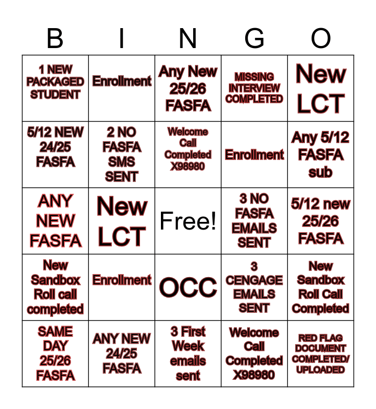 This bingo card has a free space and 24 words: Enrollment, ANY NEW 24/25 FASFA, Welcome Call Completed X98980, SAME DAY 25/26 FASFA, New LCT, 1 NEW PACKAGED STUDENT, 5/12 NEW 24/25 FASFA, Enrollment, 3 NO FASFA EMAILS SENT, OCC, Enrollment, ANY NEW FASFA, 3 CENGAGE EMAILS SENT, New Sandbox Roll Call Completed, 2 NO FASFA SMS SENT, Welcome Call Completed X98980, 5/12 new 25/26 FASFA, Any New 25/26 FASFA, Any 5/12 FASFA sub, New LCT, RED FLAG DOCUMENT COMPLETED/ UPLOADED, New Sandbox Roll call completed, MISSING INTERVIEW COMPLETED and 3 First Week emails sent.