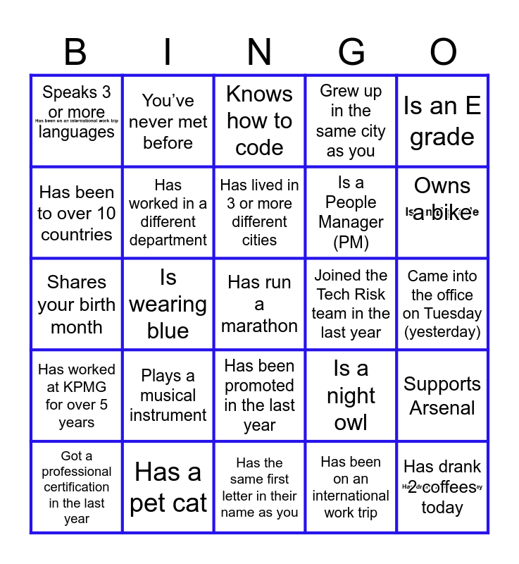 This bingo card has 3 images and 25 words: Has worked at KPMG for over 5 years, Has a pet cat, Has run a marathon, Has been on an international work trip, Is an E grade, Speaks 3 or more languages, You’ve never met before, Knows how to code, Joined the Tech Risk team in the last year, Supports Arsenal, Has been to over 10 countries, Has worked in a different department, Has the same first letter in their name as you, Is a night owl, Owns a bike, Got a professional certification in the last year, Is wearing blue, Has lived in 3 or more different cities, Is a People Manager (PM), Came into the office on Tuesday (yesterday), Shares your birth month, Plays a musical instrument, Has been promoted in the last year, Grew up in the same city as you and Has drank 2 coffees today.