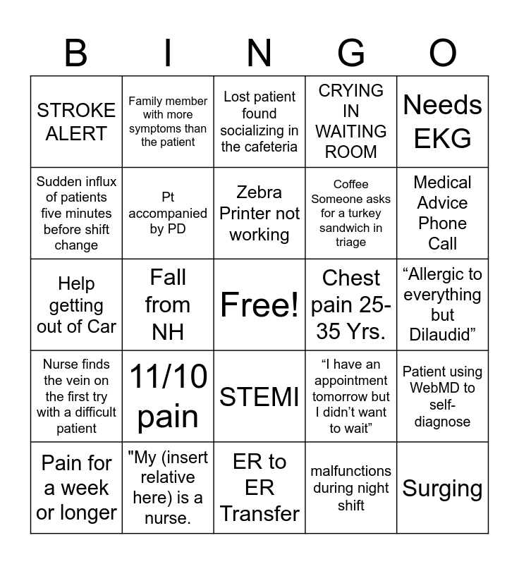 This bingo card has a free space and 28 words: Patient using WebMD to self-diagnose, Someone asks for a turkey sandwich in triage, Coffee Someone asks for a turkey sandwich in triage, malfunctions during night shift, Sudden influx of patients five minutes before shift change, Lost patient found socializing in the cafeteria, Family member with more symptoms than the patient, Nurse finds the vein on the first try with a difficult patient, Chest pain 25-35 Yrs., Pain for a week or longer, Help getting out of Car, CRYING IN WAITING ROOM, "My (insert relative here) is a nurse., ER to ER Transfer, Medical Advice Phone Call, ABD Pain Pt asking to eat,, 11/10 pain, Pt accompanied by PD, Zebra Printer not working, STEMI, STROKE ALERT, SEPSIS ALERT, Surging, Fall from NH, “Allergic to everything but Dilaudid”, “I have an appointment tomorrow but I didn’t want to wait”, Needs EKG and Family member tries to answer all the questions.