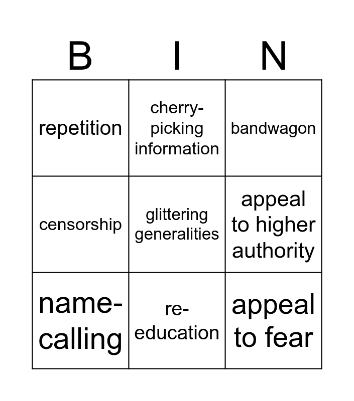 This bingo card has 9 words: name-calling, bandwagon, cherry-picking information, censorship, repetition, appeal to higher authority, glittering generalities, appeal to fear and re-education.