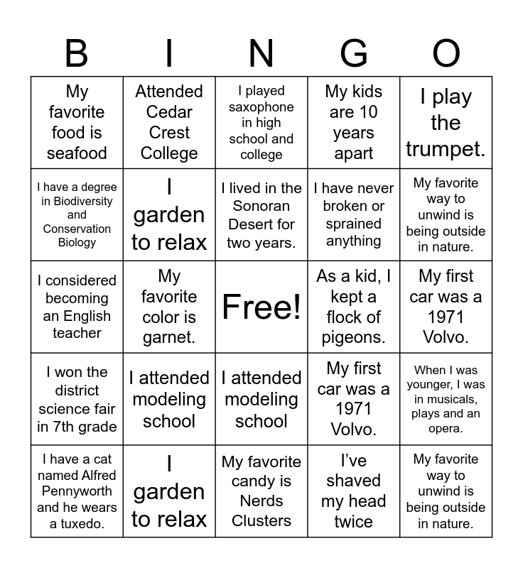 This bingo card has a free space and 48 words: I have dove on the easternmost and southernmost point in the US, My favorite way to unwind is being outside in nature., I have a cat named Alfred Pennyworth and he wears a tuxedo., My favorite candy is Nerds Clusters, I attended modeling school, I won the district science fair in 7th grade, Attended Cedar Crest College, Moved to Tallahassee in 2016, I have a degree in Biodiversity and Conservation Biology, The beach is my peaceful place, I garden to relax, My kids are 10 years apart, When I was younger, I was in musicals, plays and an opera., My first car was a 1971 Volvo., I have two sisters and eight cousins., I am the middle child of three., I lived in the Sonoran Desert for two years., As a kid, I kept a flock of pigeons., I got the gift of gab from the Blarney Stone., I play the trumpet., My favorite color is garnet., I’ve shaved my head twice, My favorite food is seafood, I have never broken or sprained anything, I have dove on the easternmost and southernmost point in the US, My favorite way to unwind is being outside in nature., I have a cat named Alfred Pennyworth and he wears a tuxedo., My favorite candy is Nerds Clusters, I attended modeling school, I won the district science fair in 7th grade, Attended Cedar Crest College, Moved to Tallahassee in 2016, I have a degree in Biodiversity and Conservation Biology, The beach is my peaceful place, I garden to relax, My kids are 10 years apart, When I was younger, I was in musicals, plays and an opera., My first car was a 1971 Volvo., I have two sisters and eight cousins., I am the middle child of three., I lived in the Sonoran Desert for two years., As a kid, I kept a flock of pigeons., I played saxophone in high school and college, I’ve broken my nose three times, I considered becoming an English teacher, I’ve shaved my head twice, My favorite food is seafood and I have never broken or sprained anything.