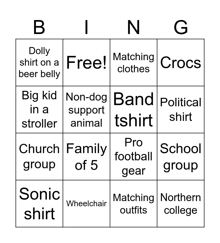 This bingo card has 19 words: Pro football gear, #blessed, Matching clothes, Northern college, School group, Big kid in a stroller, Matching outfits, Dolly shirt on a beer belly, Free!, Church group, Family of 5, Non-dog support animal, Band tshirt, Wheelchair, Sonic shirt, Southern college, Crocs, Political shirt and Tantrum.