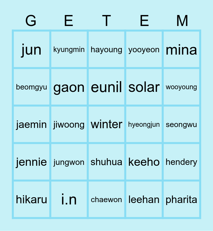This bingo card has 30 words: i.n, dami, jiwoong, danielle, jun, hayoung, gaon, shuhua, hyeongjun, chaewon, seongwu, winter, leehan, pharita, wooyoung, bae, keeho, jennie, jungwon, mina, jaemin, iu, kyungmin, solar, beomgyu, yooyeon, hendery, hikaru, eunil and wendy.