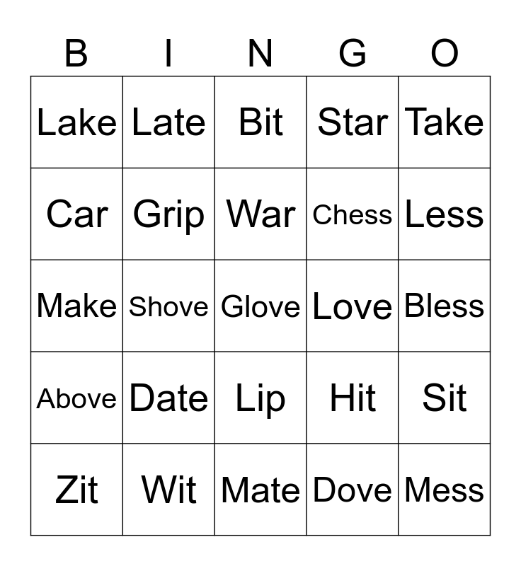 This bingo card has 35 words: Slip, Dip, Hip, Grip, Lip, Star, Car, Far, War, Bar, Make, Take, Shake, Wake, Lake, Love, Dove, Shove, Above, Glove, Hit, Zit, Sit, Wit, Bit, Less, Mess, Guess, Chess, Bless, Hate, Mate, Date, Late and Fate.