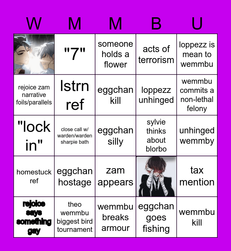 This bingo card has 2 images, a free space and 22 words: eggchan hostage, theo wemmbu biggest bird tournament, eggchan kill, rejoice says something gay, loppezz is mean to wemmbu, rejoice zam narrative foils/parallels, "7", sylvie thinks about blorbo, zam appears, loppezz unhinged, "lock in", tax mention, lstrn ref, eggchan goes fishing, unhinged wemmby, someone holds a flower, wemmbu commits a non-lethal felony, close call w/ warden/warden sharpie bath, wemmbu kill, homestuck ref, acts of terrorism and wemmbu breaks armour.