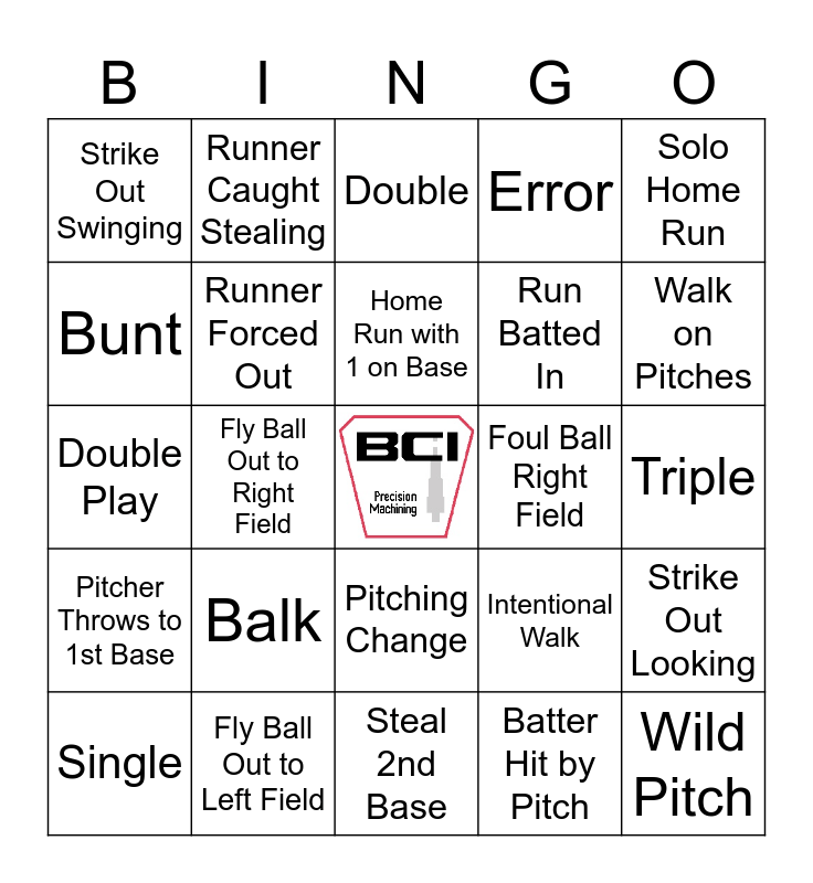This bingo card has a free space and 29 words: Single, Sacrifice Fly, Fly Ball Out to Right Field, Bases Loaded, Strike Out Swinging, Double, Runner Forced Out, Balk, Foul Ball Right Field, Fly Ball Out to Left Field, Triple, Wild Pitch, Steal 2nd Base, Batter Hit by Pitch, Walk on Pitches, Full Count, Pitching Change, Pitcher Throws to 1st Base, Solo Home Run, Double Play, Intentional Walk, Slide into 3rd Base, Run Batted In, Bunt, Error, Runner Caught Stealing, Strike Out Looking, Home Run with 1 on Base and Line Drive into Centerfield.