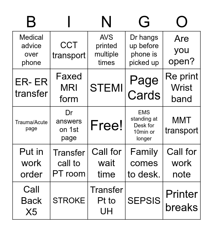 This bingo card has a free space and 26 words: Call for wait time, SEPSIS, STEMI, STROKE, Are you open?, Medical advice over phone, ER- ER transfer, CCT transport, MMT transport, Family comes to desk., Page Cards, Trauma/Acute page, Call for work note, Call Back X5, Dr answers on 1st page, Get pt blanket, Dr hangs up before phone is picked up, Put in work order, AVS printed multiple times, Printer breaks, Re print Wrist band, Transfer Pt to UH, EMS standing at Desk for 10min or longer, Transfer call to PT room, Faxed MRI form and NH calls to give report.