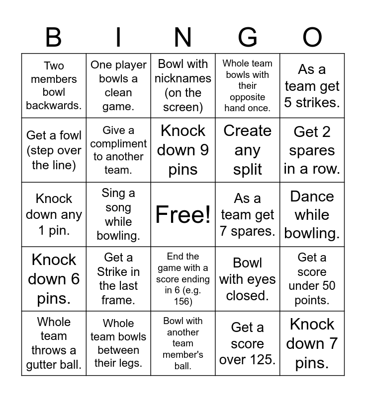 This bingo card has a free space and 24 words: Get a Strike in the last frame., Whole team bowls between their legs., Knock down 9 pins, Whole team throws a gutter ball., As a team get 5 strikes., Two members bowl backwards., Get a fowl (step over the line), One player bowls a clean game., As a team get 7 spares., End the game with a score ending in 6 (e.g. 156), Create any split, Knock down any 1 pin., Bowl with eyes closed., Get a score under 50 points., Give a compliment to another team., Get a score over 125., Dance while bowling., Bowl with nicknames (on the screen), Get 2 spares in a row., Sing a song while bowling., Knock down 7 pins., Knock down 6 pins., Whole team bowls with their opposite hand once. and Bowl with another team member's ball..