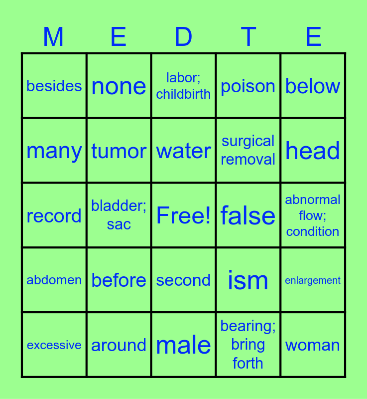 This bingo card has a free space and 24 words: before, around, water, excessive, below, besides, many, none, false, second, surgical removal, record, ism, enlargement, tumor, bearing; bring forth, abnormal flow; condition, labor; childbirth, head, bladder; sac, woman, abdomen, poison and male.