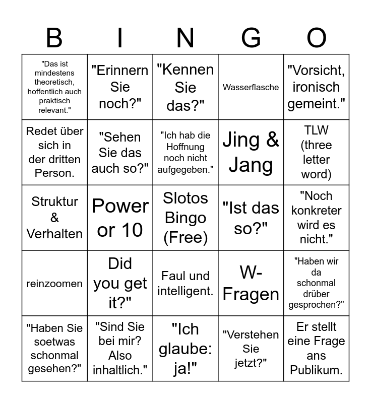 This bingo card has a free space and 25 words: Did you get it?", "Ich glaube: ja!", "Ich hab die Hoffnung noch nicht aufgegeben.", "Haben Sie soetwas schonmal gesehen?", "Vorsicht, ironisch gemeint.", "Das ist mindestens theoretisch, hoffentlich auch praktisch relevant.", Redet über sich in der dritten Person., "Erinnern Sie noch?", "Ist das so?", Faul und intelligent., Jing & Jang, Struktur & Verhalten, W-Fragen, "Haben wir da schonmal drüber gesprochen?", "Sehen Sie das auch so?", "Ist das nach- vollzieh-bar?", "Noch konkreter wird es nicht.", "Kennen Sie das?", TLW (three letter word), Power or 10, Er stellt eine Frage ans Publikum., "Sind Sie bei mir? Also inhaltlich.", reinzoomen, Wasserflasche and "Verstehen Sie jetzt?".