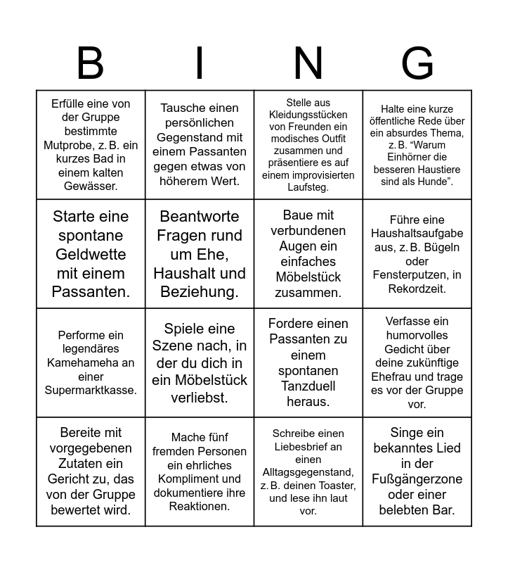 This bingo card has 16 words: Mache fünf fremden Personen ein ehrliches Kompliment und dokumentiere ihre Reaktionen., Verfasse ein humorvolles Gedicht über deine zukünftige Ehefrau und trage es vor der Gruppe vor., Stelle aus Kleidungsstücken von Freunden ein modisches Outfit zusammen und präsentiere es auf einem improvisierten Laufsteg., Erfülle eine von der Gruppe bestimmte Mutprobe, z. B. ein kurzes Bad in einem kalten Gewässer., Performe ein legendäres Kamehameha an einer Supermarktkasse., Tausche einen persönlichen Gegenstand mit einem Passanten gegen etwas von höherem Wert., Fordere einen Passanten zu einem spontanen Tanzduell heraus., Schreibe einen Liebesbrief an einen Alltagsgegenstand, z. B. deinen Toaster, und lese ihn laut vor., Starte eine spontane Geldwette mit einem Passanten., Beantworte Fragen rund um Ehe, Haushalt und Beziehung., Bereite mit vorgegebenen Zutaten ein Gericht zu, das von der Gruppe bewertet wird., Halte eine kurze öffentliche Rede über ein absurdes Thema, z. B. “Warum Einhörner die besseren Haustiere sind als Hunde”., Spiele eine Szene nach, in der du dich in ein Möbelstück verliebst., Führe eine Haushaltsaufgabe aus, z. B. Bügeln oder Fensterputzen, in Rekordzeit., Baue mit verbundenen Augen ein einfaches Möbelstück zusammen. and Singe ein bekanntes Lied in der Fußgängerzone oder einer belebten Bar..